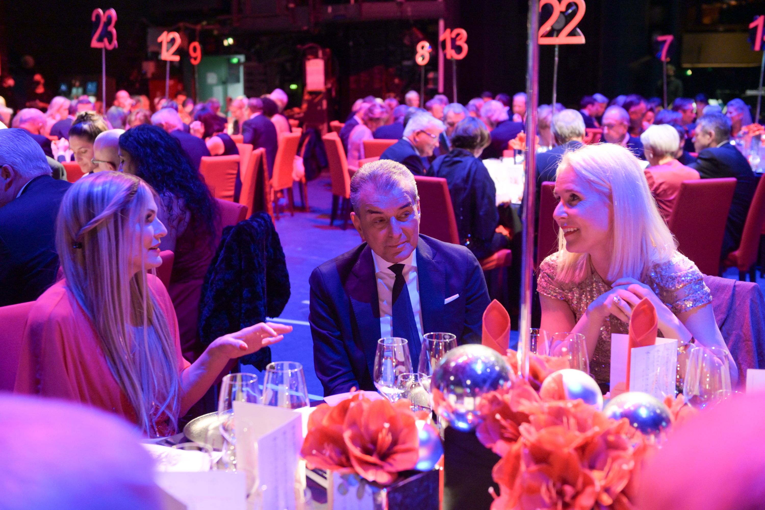 Schneller als jeder Kostümwechsel wurde die große Bühne anschließend vom Konzert- in ein Dinner-Setting verwandelt. Die große Drehbühne schwang einmal herum und schon konnte das Publikum sich am Anblick der festlich gedeckten Tische erfreuen. Nach dem traditionellen Dinner wurden die Gäste noch einmal auf die Gesangsprobe gestellt. Beim Abschlusslied Funiculì, Funiculà animierte Stefan Pop – auf einer blumengeschmückten Schaukel schwebend – gemeinsam mit Chorleiter Tilman Michael die Gäste zum Mitsingen. Den feierlichen Abschluss des offiziellen Teils läutete dabei der Glitzerregen ein, der die Bühne in ein ein helles Funkeln tauchte.