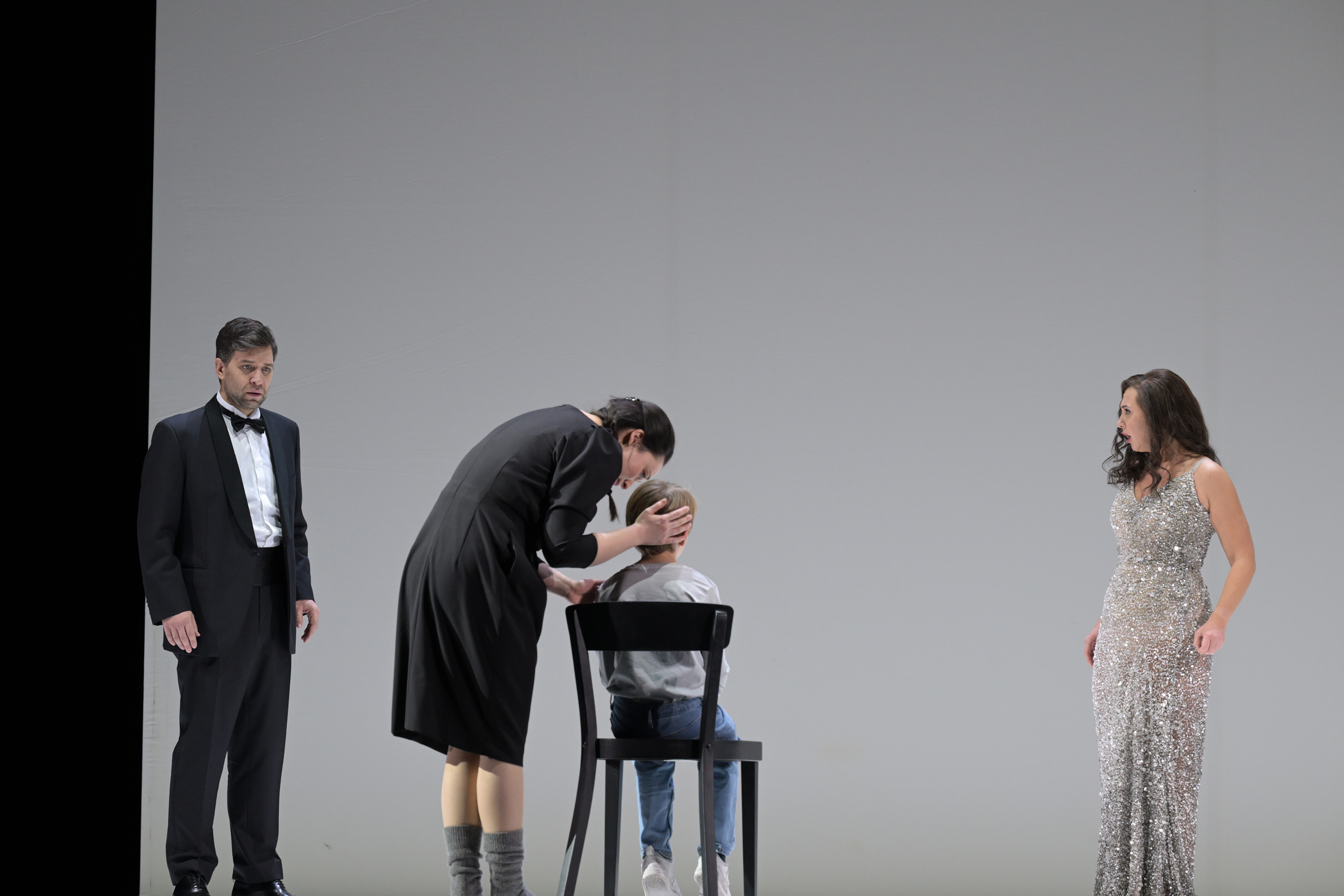 Als nun auch Sharpless ihr zu der neuen Verbindung rät, da Pinkerton vielleicht nie mehr zu ihr zurückkehren werde, präsentiert sie ihm den gemeinsamen Sohn. Sollte sie gezwungen sein, wieder als Geisha ihr Leben zu fristen, will sie lieber sterben. Erschüttert zieht Sharpless sich zurück. Wütend vertreibt Suzuki den immer noch um das Haus schleichenden Goro, der davor warnt, ein vaterloses Kind werde kein leichtes Leben haben.