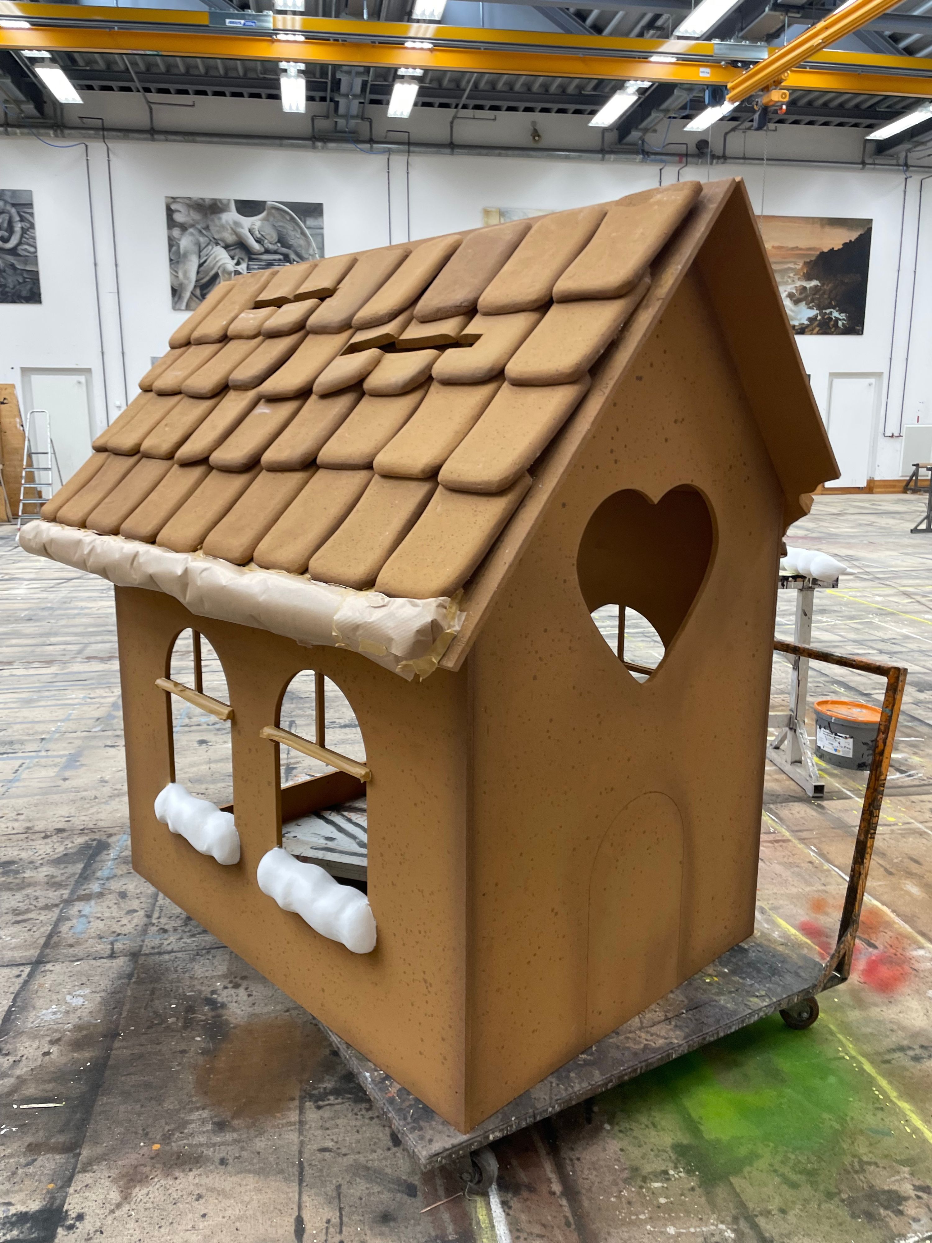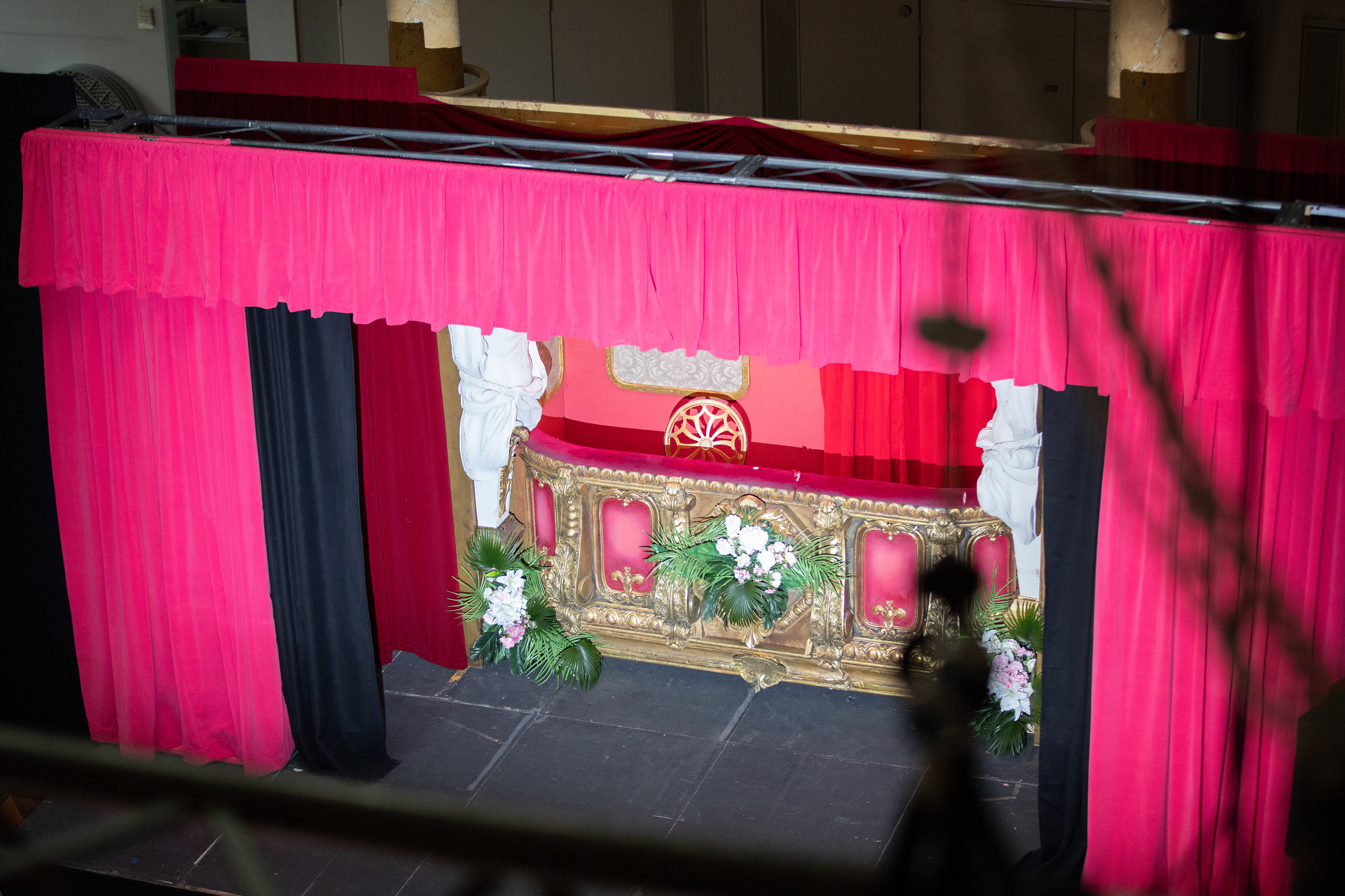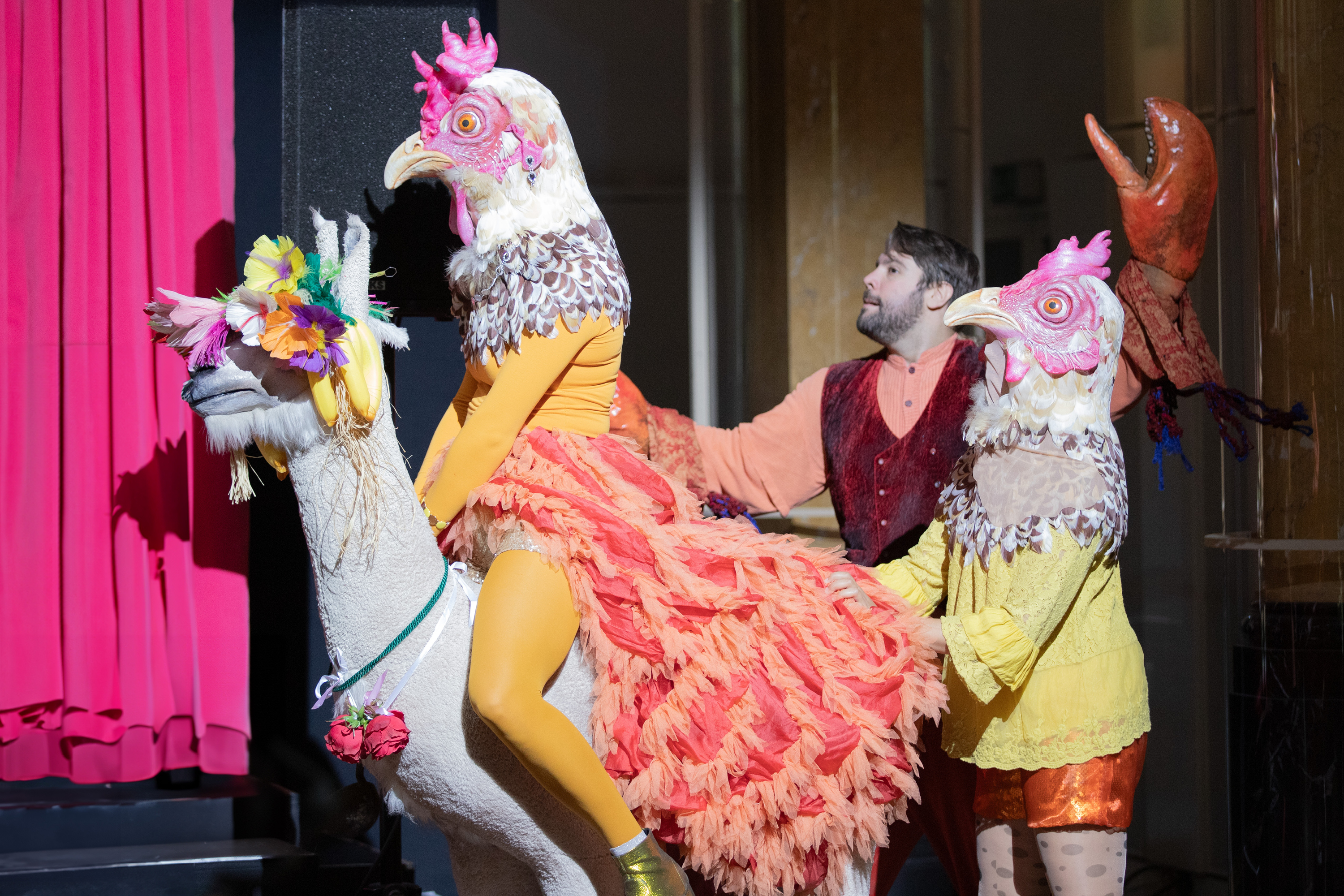 Wir haben uns vorgenommen, für unseren neuen Spielort NEUE KAISER, auch weiterhin möglichst nachhaltig zu arbeiten, weil Recycling Sinn macht, Ressourcen spart und wertschätzend ist. So haben wir in der OPER FÜR KINDERFlügel hoch, ich bin bewaffnet! viele Lieblingselemente aus früheren Produktionen wiedergesehen: Die Loge stammt aus La damnation de Faust (Regie: Harry Kupfer, Bühnenbild: Hans Schavernoch), die beiden Atlanten an den Logenseiten stammen aus dem I puritani-Bühnenbild (Inszenierung: Vincent Boussard, Bühnenbild: Johannes Leiacker). Diese Gruppe – Loge und Atlanten – kam bereits im Stream Der Karneval der Tiere zum Einsatz. Die Hühnerköpfe und die Fuchs-Maske hingegen sind ursprünglich für die Produktion Das schlaue Füchslein entstanden. Die Scheren des Hummers haben vor ein paar Jahren in der Martinů-Trilogie im Bockenheimer Depot mitgezwickt. Das Lama haben wir uns beim Schauspiel ausgeliehen, wo es im Dezember in Der Raub der Sabinerinnen mitwirken wird.